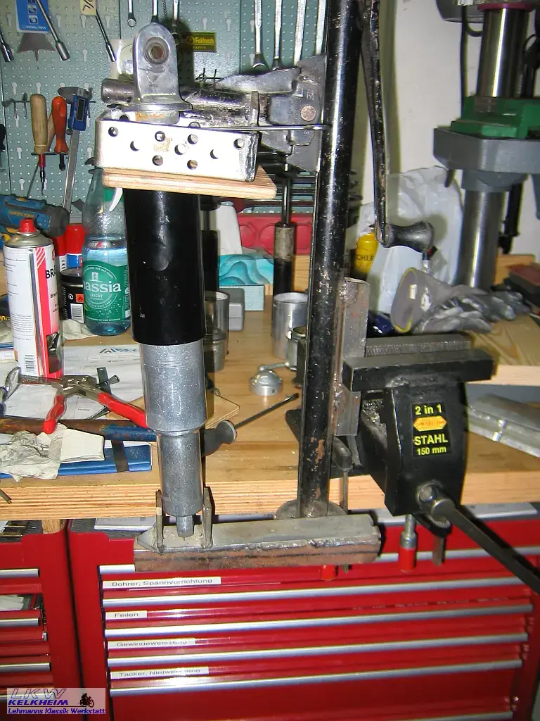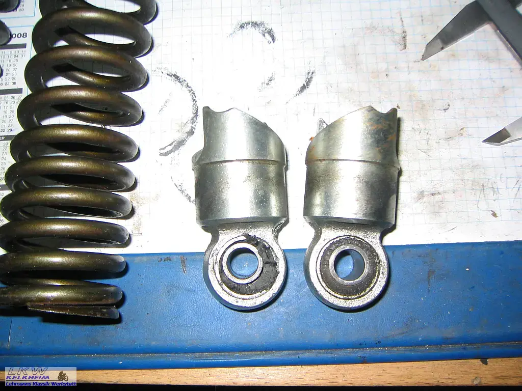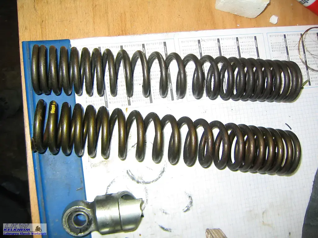Die Federn der Stoßdämpfer waren fast alle unterschiedlich. Also fegte der Holländer zusammen, was noch in der Werkstatt herumlag. Auch die Silentblöcke waren alle verschlissen.