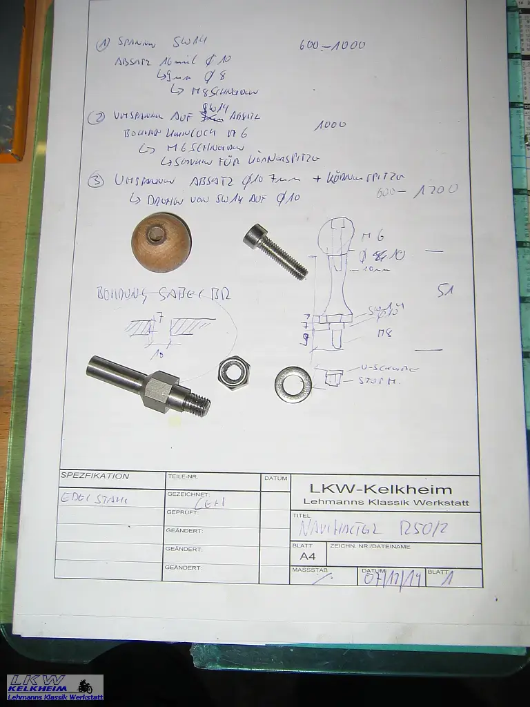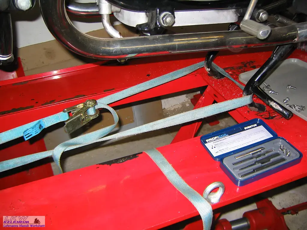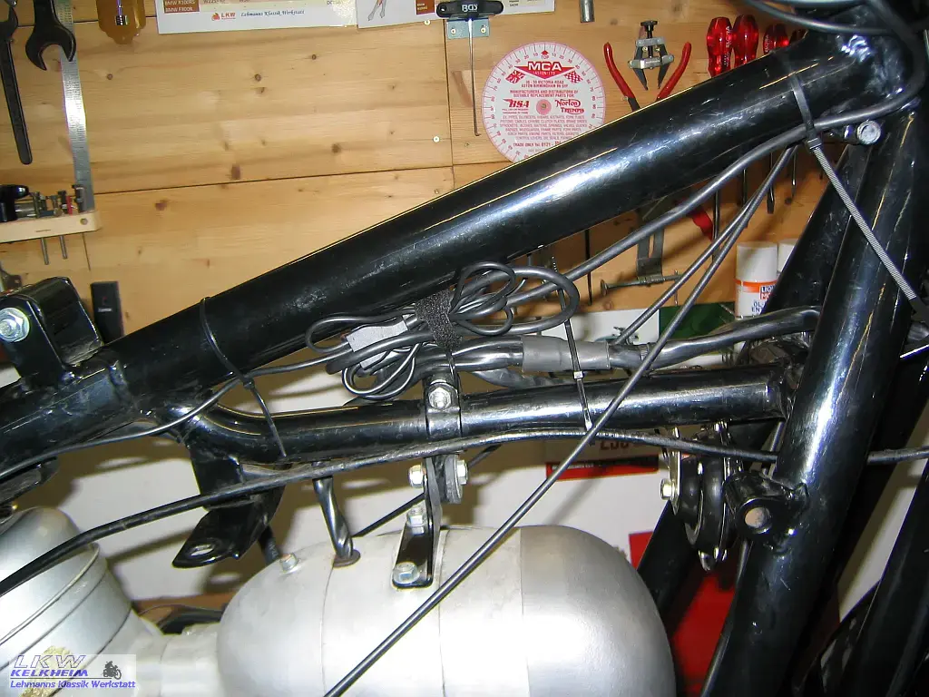 Nebenbei gab es noch eine große Inspektion, der Seitenständer wurde neu befestigt, die fehlenden Halteschellen am Krümmer angebracht und die Verschraubungen mit Kühlsternen versehen. Der Kaltstartschieber des Luftfilterkastens wurde gangbar gemacht, neue Motorbefestigungsbolzen und gleich-schließende Lenkschlösser und Werkzeugfachschlösser eingebaut. Zuletzt wurden die Kohlebürsten der Lichtmaschine durch neue ersetzt.