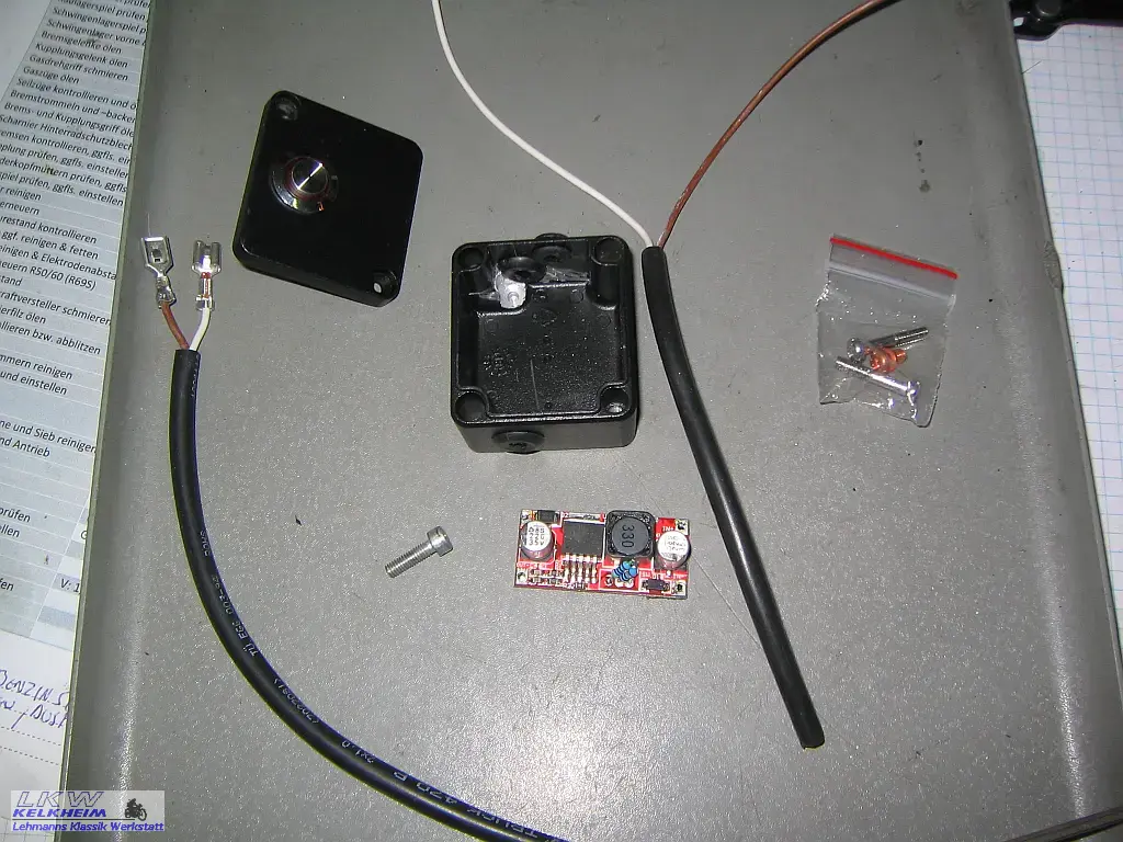 Da die R50/2 ein 6 Volt Bordnetz hat, habe ich einen 6V auf 12V Wandler angeschlossen. Dieser kam in ein Metallgehäuse, zusammen mit einem Schalter zum Abschalten des Wandlers. So wird verhindert, dass der Ruhestrom des Wandlers die Batterie tief entlädt.