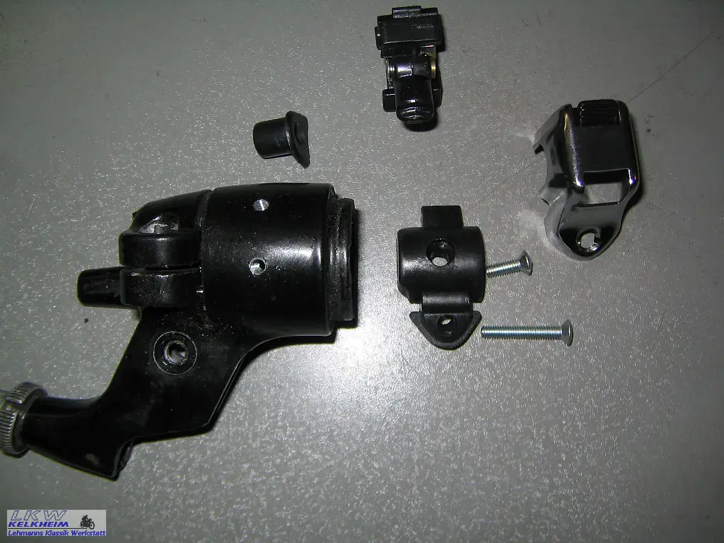 Der Blinkerschalter, ein Universalschalter am Lenkerrohr, ist relativ weit entfernt und nur sehr unbequem zu bedienen. Für den Schalter am Gasgriff gibt es einen Kunststoffadapter, der mit zwei Schrauben befestigt wird. Entsprechende Bohrungen mit Gewinde wurden angebracht.