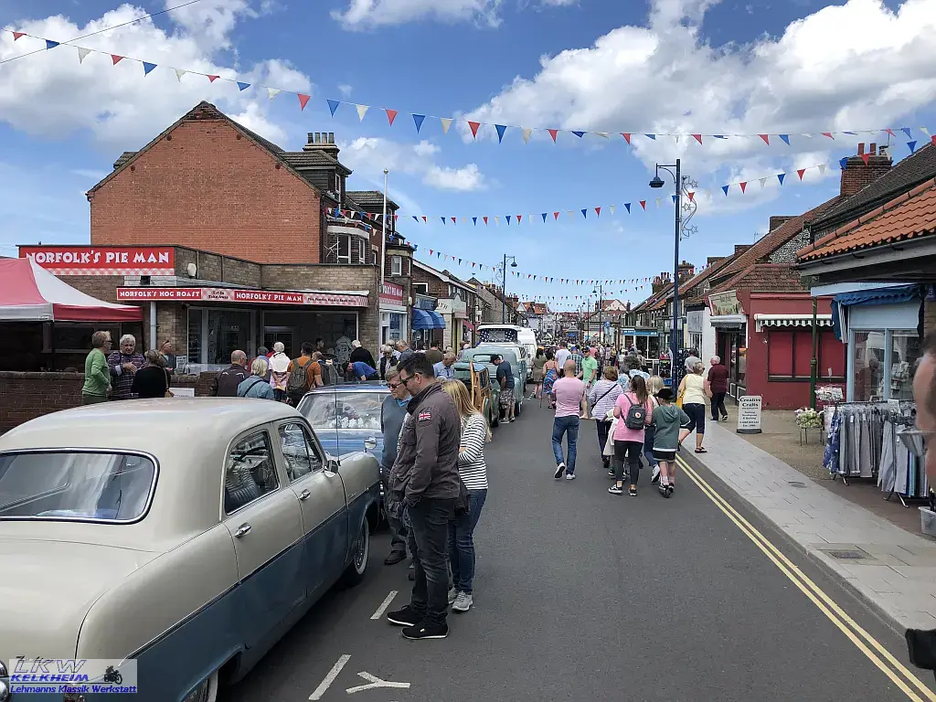 Erst die Ausfahrt am Sonntag war trocken und einigermaßen schön. Sie führte uns nach Sheringham, wo gleichzeitig ein Oldtimertreffen und ein Stadtfest stattfanden.