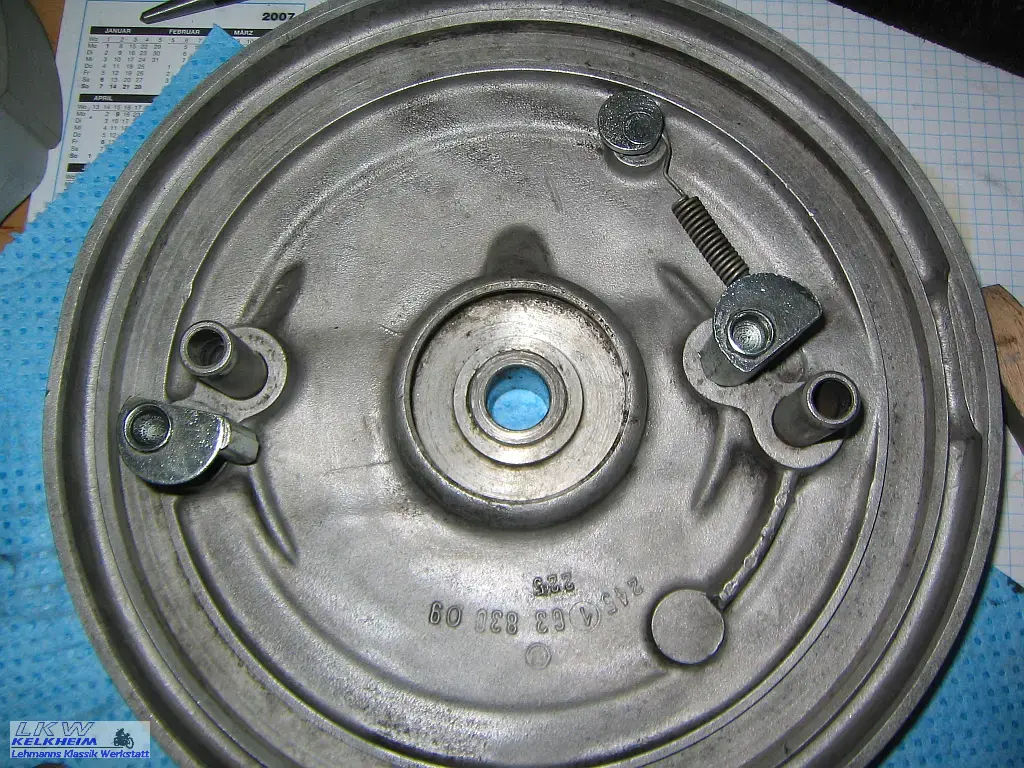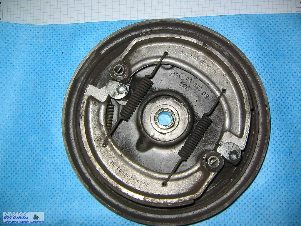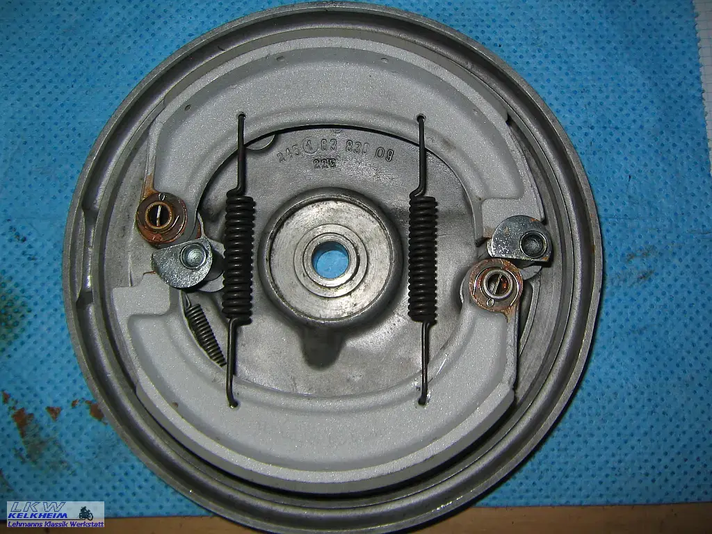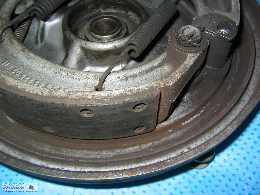 Zuerst wird das Vorderrad ausgebaut und zu Medidenta gebracht. Dort wurde die Bremstrommel ausgedreht und die Beläge der Bremsbacken auf den neuen Bremstrommeldurchmesser angepasst. Auch wurde das ausgeschlagene Lager des Bremsschlüssels ausgetauscht.