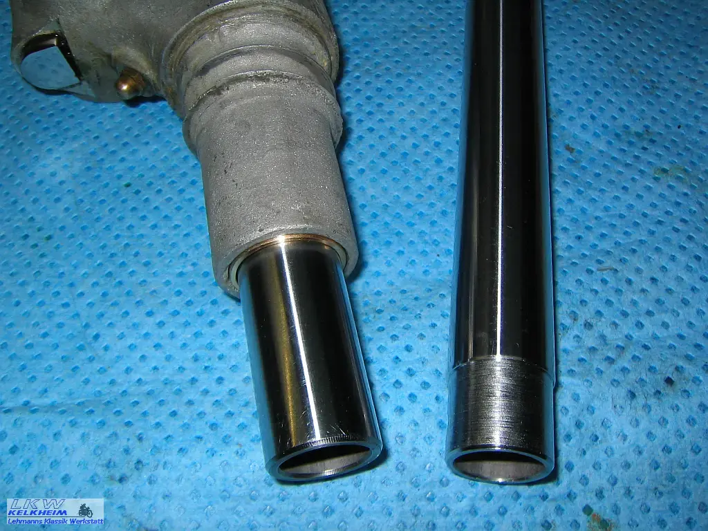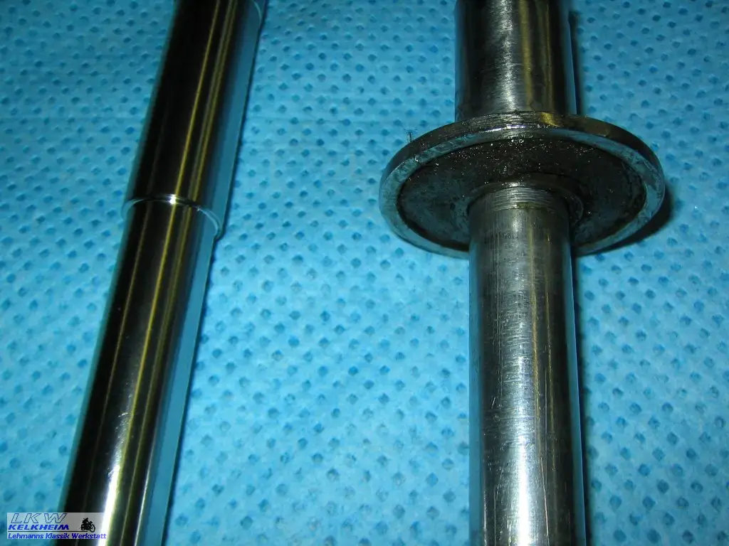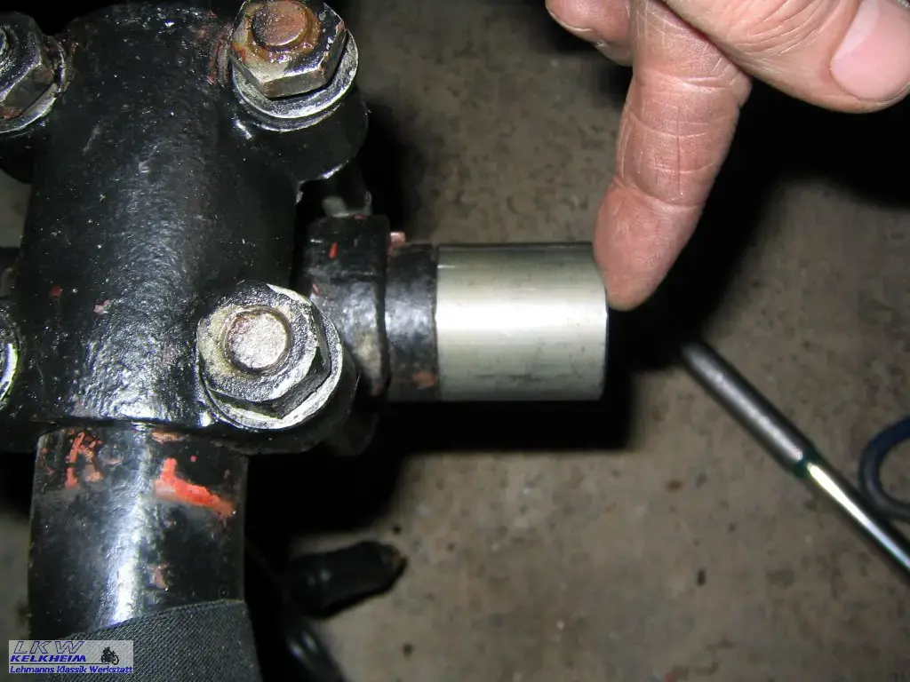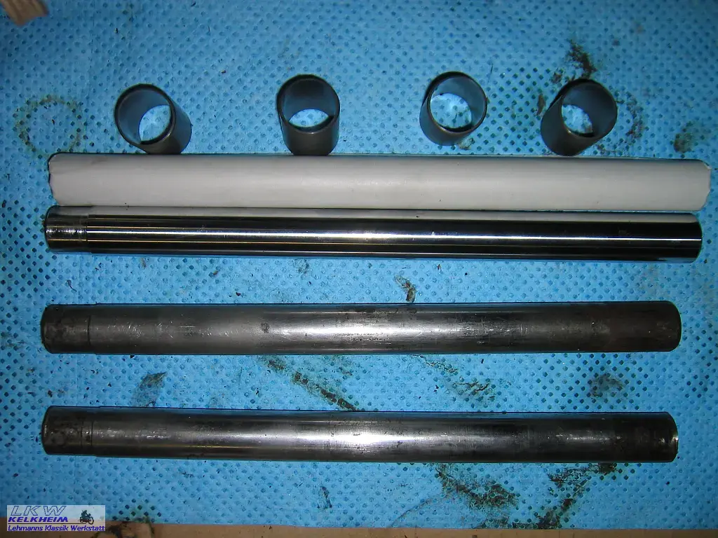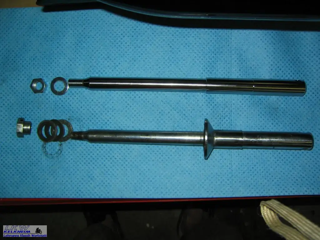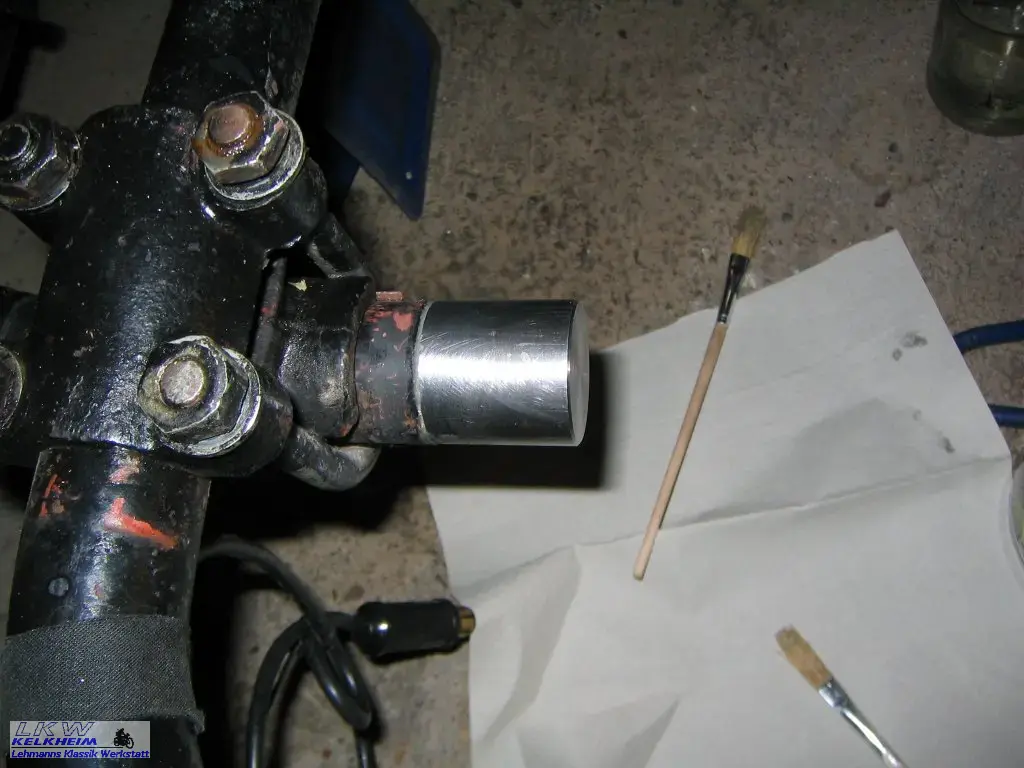 Neue Federstangen waren leicht zu bekommen. Aber die Lagerbuchsen mussten genau angepasst werden. Harald hatte noch das passende Material und Werkzeug und fertigte zwei Buchsen an, in denen die Federstangen perfekt gleiten.