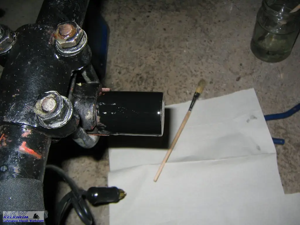 Da ich weder in das Nummernschild noch in den Kotflügel neue Löcher bohren wollte, habe ich zwei spezielle Halterungen aus Blech geschnitten und gebogen. Etwas schwarze Farbe und alte Schrauben und Muttern aus der Krabbel-Kiste - und schon sieht es authentisch aus.