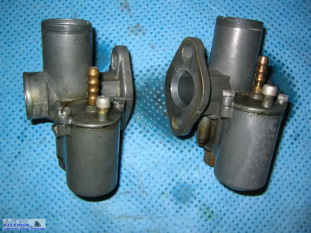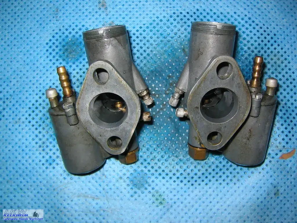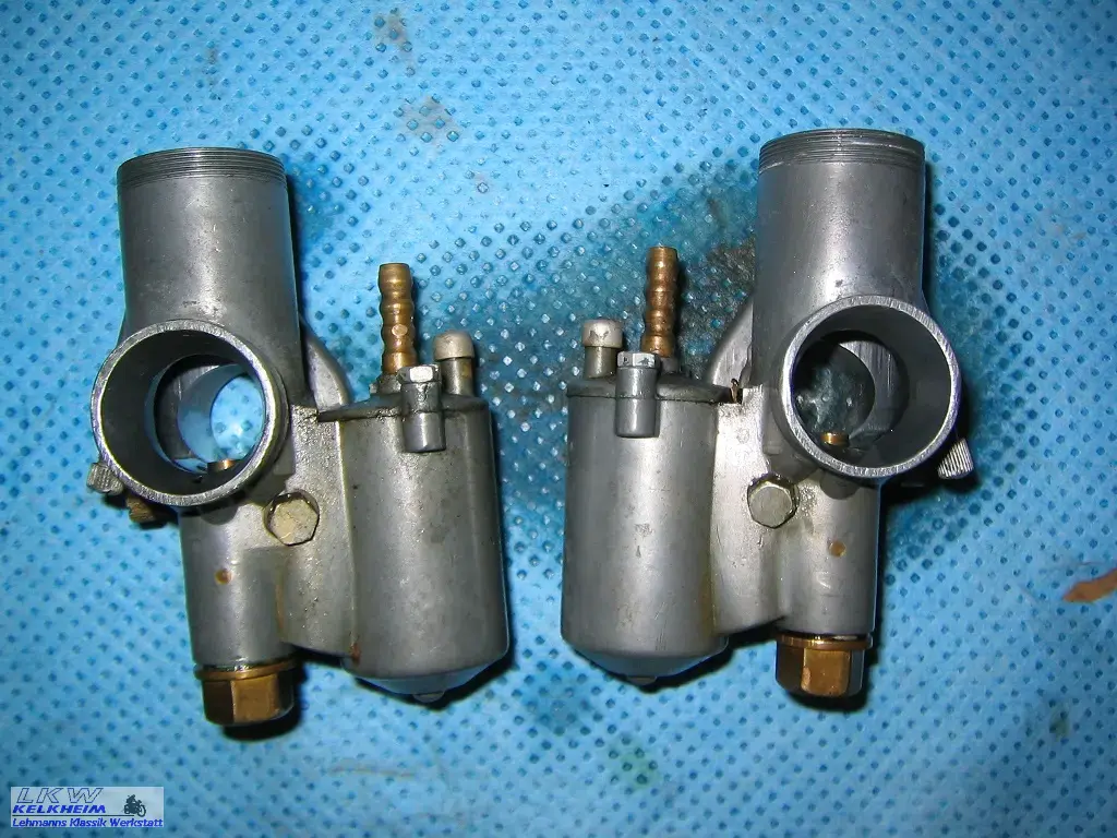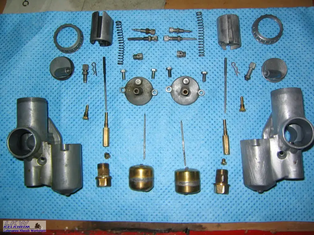 Meine beiden Vergaser sahen optisch gut aus und hatten seit der Überholung nur 170 km auf dem Tacho. Das war allerdings vor fast 10 Jahren. Eine Grundreinigung kann also nicht schaden. Außerdem wollte ich die Einstellung und die Düsen kontrollieren. Meine 4 Startversuche dauerten immer sehr lange und die Zündkerzen waren stark verrußt. OK, im Kurzstreckenbetrieb von jeweils ca. 200 m ist das nichts Ungewöhnliches. Aber die Erfahrung zeigt (z.B. 4.8er-Schrauben für Rahmenverschraubungen), besser überall nachschauen und kontrollieren, was der Restaurator da gemacht hat.