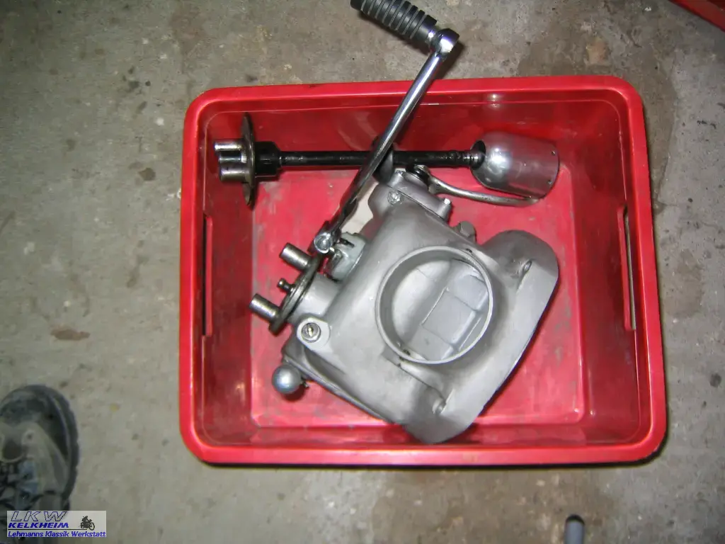 Beim K-37A wurde dieser (nutzlose) Zusatzbehälter entfernt und der Deckel der Schwimmerkammer wie bei den Bing Vergasern mit zwei Schrauben befestigt.