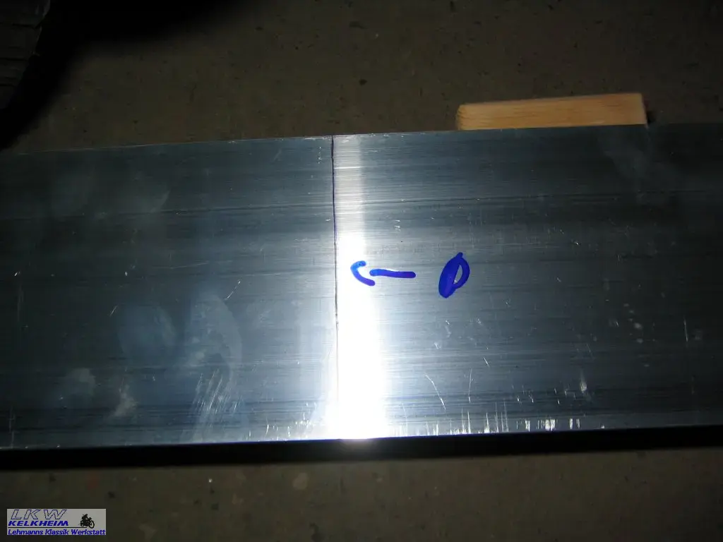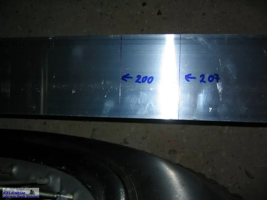 Auf der Richtlatte habe ich Markierungen für 0, 200 und 207 cm angebracht. 200 cm als Abstand für Einzylinder, 207 cm als Abstand für Boxer.