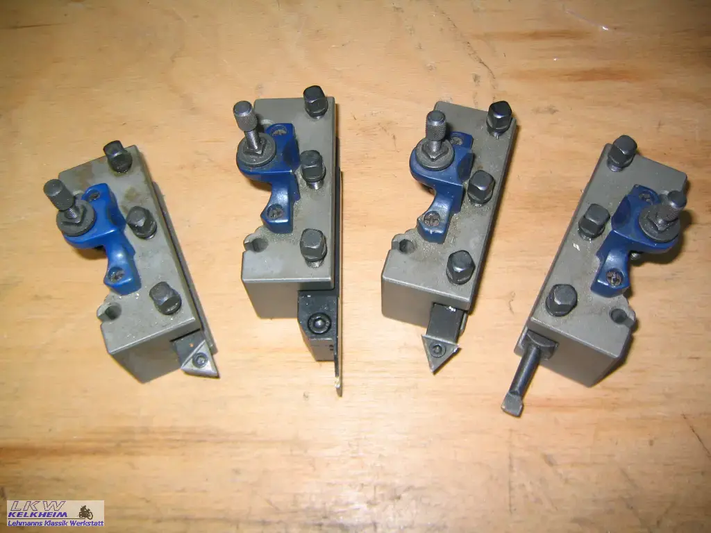 In der Regel sind Drehmaschinen ab Werk mit einem 4-fach Drehmeißelhalter ausgerüstet, bei dem die Höhe der Drehmeißel durch Unterlegen von Blechstreifen eingestellt wird. Das sollte man sich nicht antun und in einen Multifix-Halter investieren. Es gibt inzwischen preiswerte Nachbauten, die ihren Zweck erfüllen.